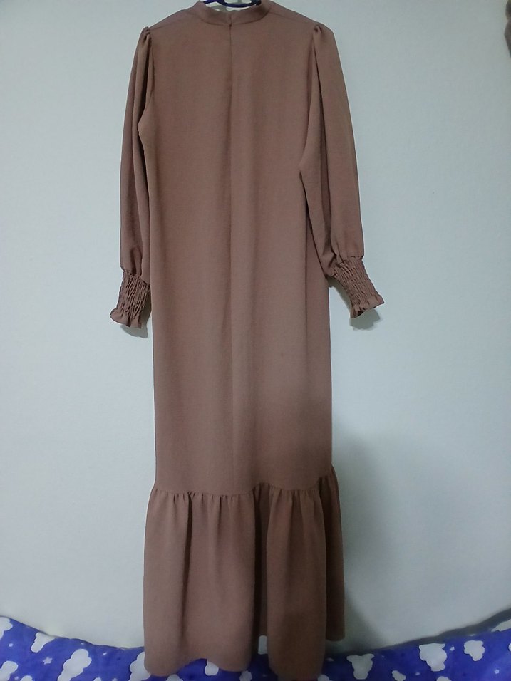 Gül kurursu renk uzun kollu, yüksek yakalı uzun elbise. Rahat kesim ve etek kısmında fırfır detayı bulunur. Yumuşak sentetik kumaştan, sade ve mütevazı tarzda.Kemer mevcuttur.