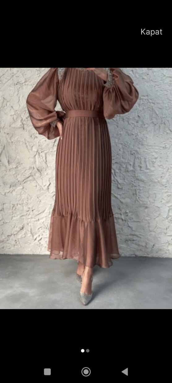 Diger markanın bej renkli, uzun piliseli elbisesi yüksek yakalı ve uzun kolludur. Parlak sentetik kumaştan üretilmiş, bol kesimli ve modern klasik bohem tarzda günlük kullanıma uygundur.