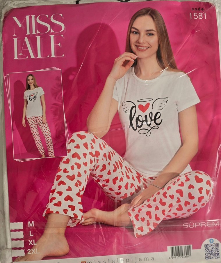 Diger markasının beyaz, kısa kollu, baskılı 'love' yazılı üstü ve kırmızı kalp desenli pantolonu olan rahat kesim pijama takımı. Rahat ve hafif kumaşlı. ❤️