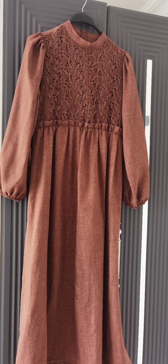 Diger marka, dantel detaylı, uzun kollu, bohem tarzda kahverengi keten kumaştan uzun elbise. Rahat ve bol kesimdir, günlük kullanım için uygundur.