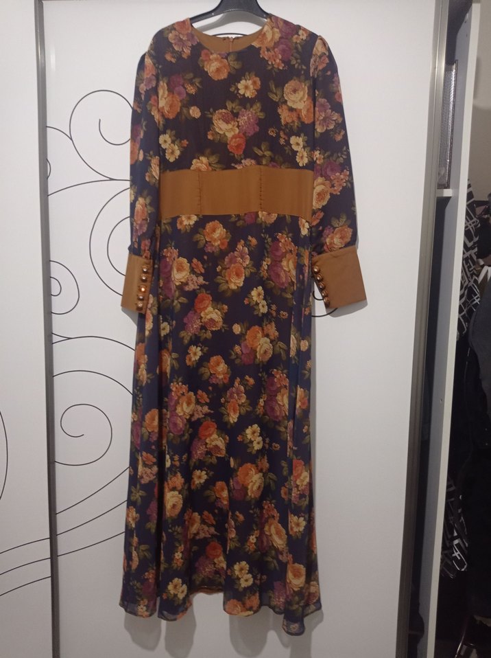 Diger markasına ait, çiçek desenli, düğmeli ve bol kesim uzun elbise. Uzun kollu, düğmeli manşetli ve yuvarlak yaka, sentetik kumaştan üretilmiştir.