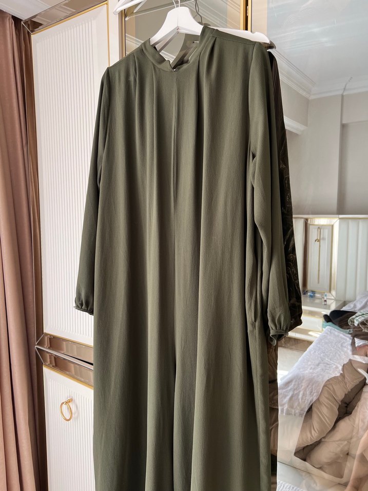 Diger marka haki renk uzun keten elbise, yüksek yaka, uzun kollu ve bol kesimdir. Minimalist ve sade tarzda, günlük kullanıma da özel kullanıma da uygun tulum şal ile birlikte gönderilcek