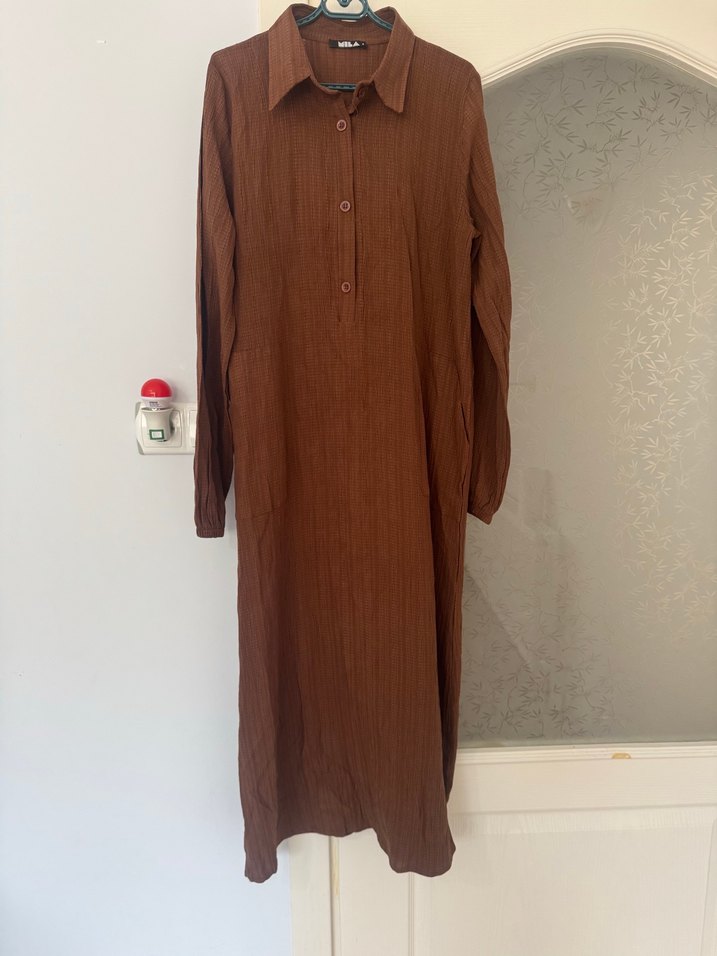 Diger markanın kahverengi keten kumaştan, uzun kollu, düğmeli ve yakalı, bol kesim uzun elbisesi. Minimalist ve bohem tarzda, sade tasarım.