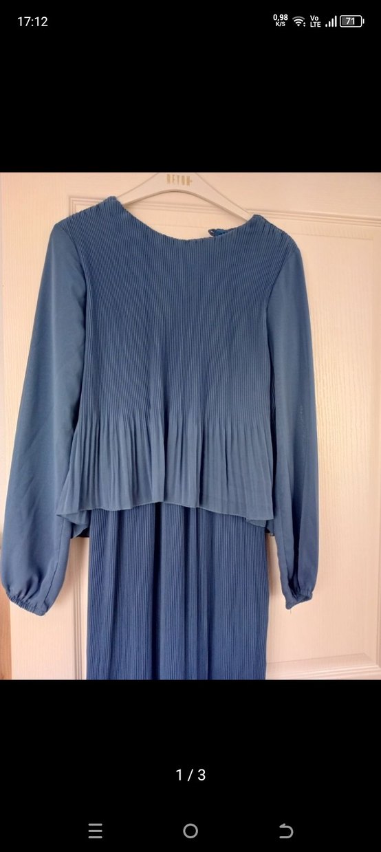 Diger marka, piliseli detaylı, bol kesim uzun elbise. Uzun kollu, yuvarlak yaka, mavi-gri tonlarda yumuşak sentetik kumaştan. Minimalist ve sade tarzda, gündelik kullanıma uygun. Temiz uzun kollu 38 beden 1 kere giydim düğünde