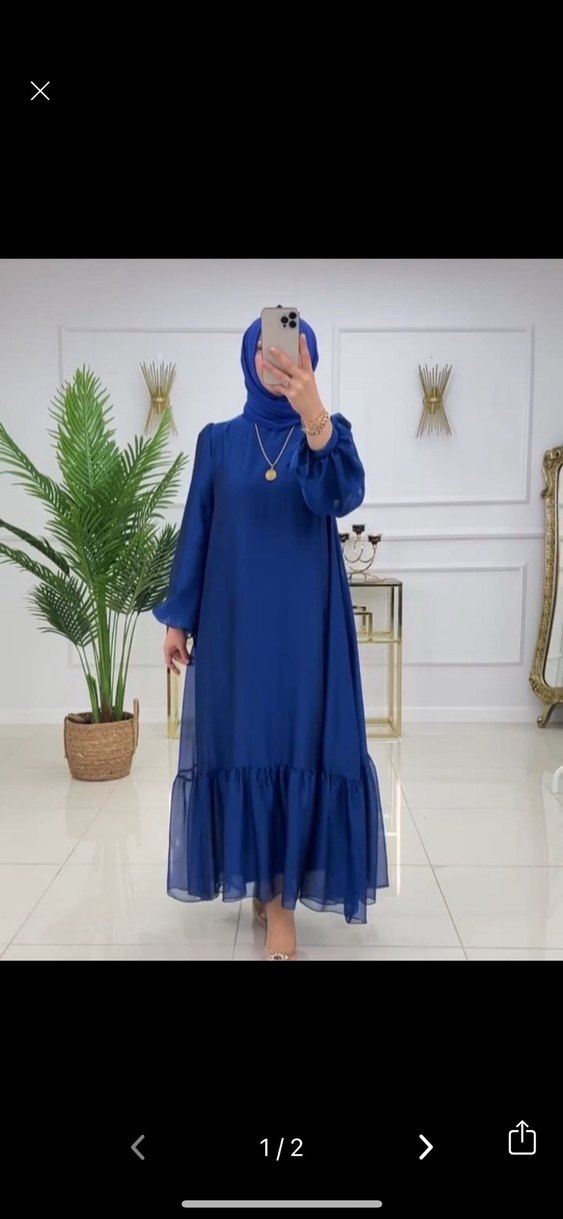 Diger markanın uzun kollu, bol kesim, yüksek yakalı, fırfırlı etek uçlu, satenimsi kumaştan yapılmış koyu mavi bohem tarzda elbise.