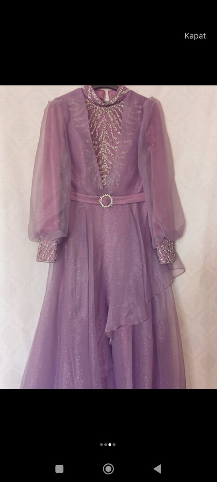 Drapeli, parlak mor uzun abiye elbise, uzun kollu ve yüksek yakalı. Gevşek kesim, vintage tarzı detaylara sahip. Sadece bı defa nisanimda giydim herhangi bir sorunu yok temiz