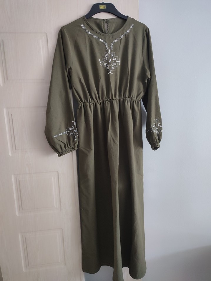 Diger markanın kışkırtıcı nakış ve boncuk detaylı, uzun kollu, yuvarlak yaka, bol kesim keten kumaştan yapılmış, haki renk uzun elbisesi.