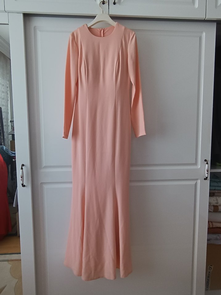 Diger marka, uzun kollu, kruvaze yakalı, pembe pastel tonlarda, ipeksi kumaştan, klasik modern tarzda, uzun ve dökümlü kadın elbisesi.