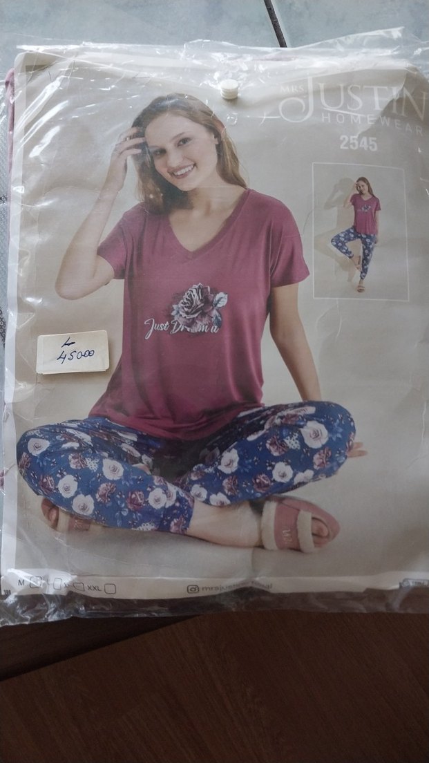 Diger markanın pastel pembe V yaka kısa kollu, çiçek desenli üst ve çiçekli pantolonlu bol kesim pijama takımı.