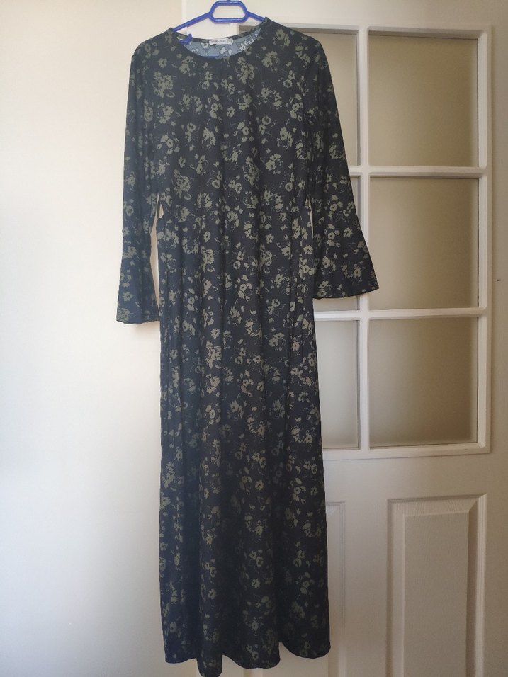 Bigdart markanın siyah uzun elbisesi, bol kesim, kemerli kol ucu volan detayli ve koyu renkli batik desen içerir. Uzun kollu, yuvarlak yakalı ve polyester likrakumaştan yapılmıştır.