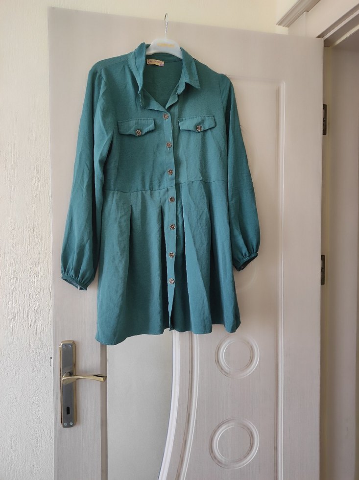 Uzun kollu, keten kumaştan, düğmeli ve yakalı turkuaz midi tunik, bol kesim, bohem tarzına uygun.