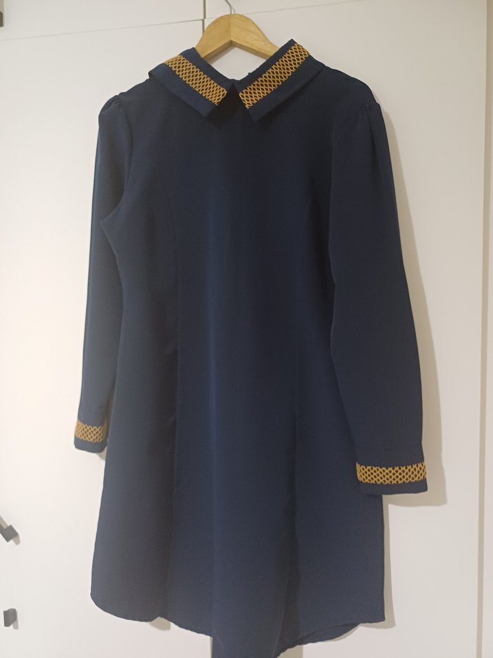 Lacivert gömlek yaka tunik, şifon-polyester arası bir kumaşı var, 44 beden yazıyor ancak dar kalıp, 40-42 ye daha çok uygun, ben şu an 44 beden giymeme rağmen bana artık olmuyor. Sayılı kullandım, alt kısmında sürgülü dolabın kapağına sıkışmadan dolayı oluşan ufak bir deformesi var, fotoğrafla göstermeye çalıştım, başka sorunu yok.