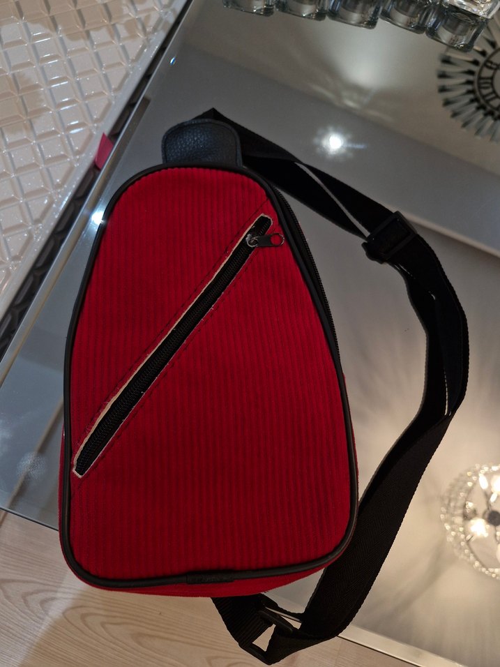 Diger markasının kırmızı biker tarzı çapraz çantası, fermuarlı ön cep ve sade, koyu tasarıma sahiptir.