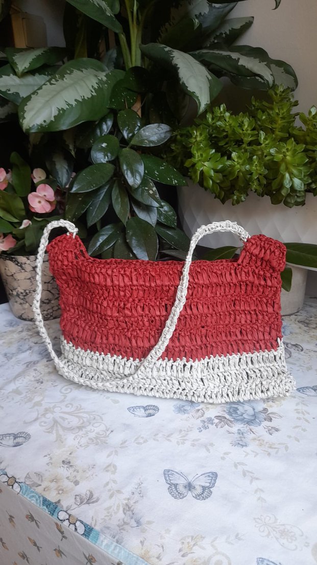 Diger markanın kırmızı ve beyaz renklerde örme tasarıma sahip, rahat bohem tarzda günlük kullanıma uygun kadın çantası. El örgüsüdür, özel üretim Hiç kullanılmadı, görseldeki gibidir Boyutları fotoğrafın ilerleyen görsellerinde mevcuttur Kağıt ip olduğu için deforme ve suya dayanıklıdır