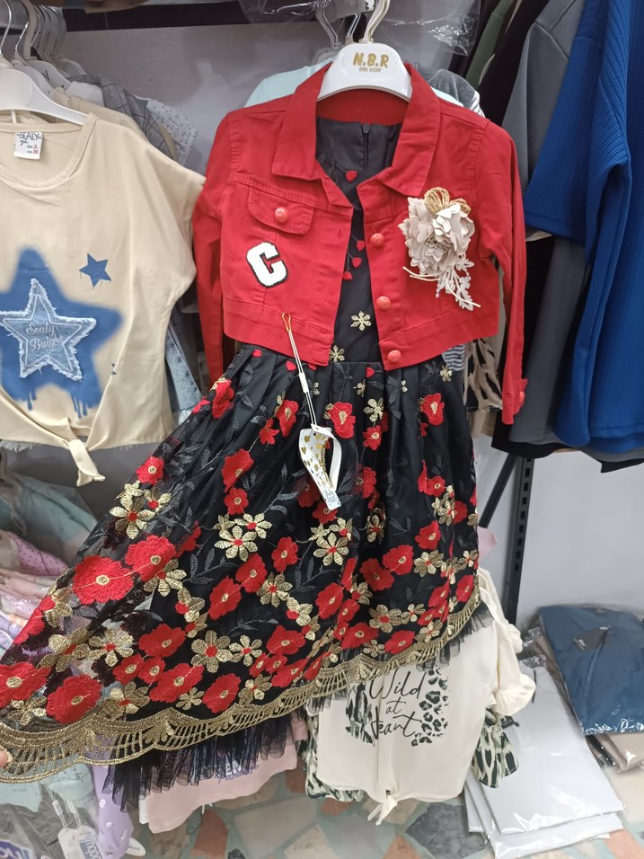 Renkli nakışlı çiçek desenli bol kesim etek ve uzun kollu, yakalı kırmızı düğmeli ceketli bohem kız çocuk elbisesi.