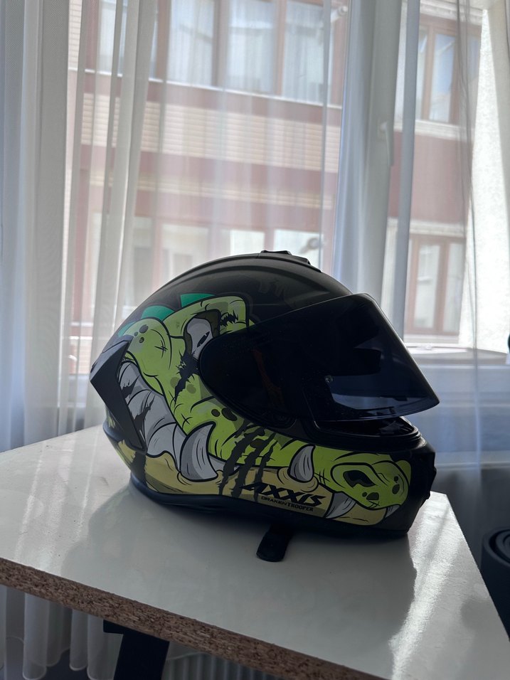 Koyu yeşil renkli, seramik malzemeden yapılmış, baskılı desenli ve tokalı kapanışa sahip motosiklet kaskı. Grunge punk tarzını yansıtır. ️
