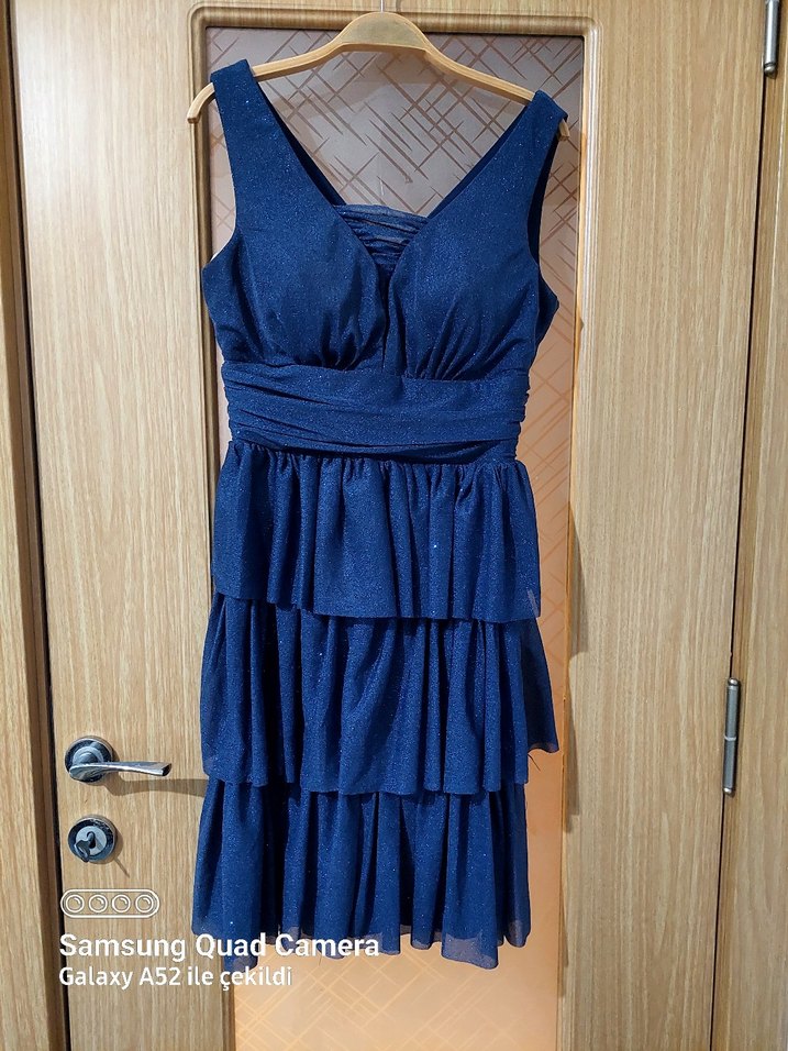 Lacivert, kolsuz, V yakalı, vücuda oturan, kat kat fırfırlı midi abiye elbise. Parti için şık ve bohem tarzda.