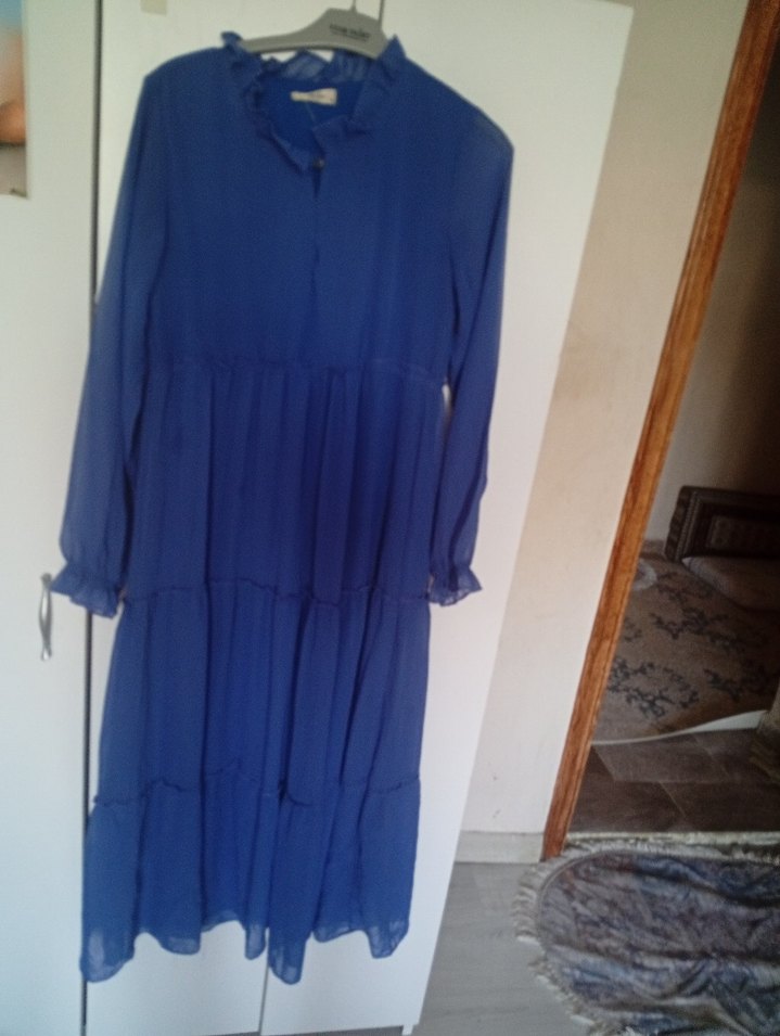 Diger markasının lacivert uzun elbisesi, bol kesim ve piliseli detaylara sahiptir. Yumuşak sentetik kumaştan, uzun kollu ve yüksek yakalıdır. Minimalist bohem tarz için uygundur.