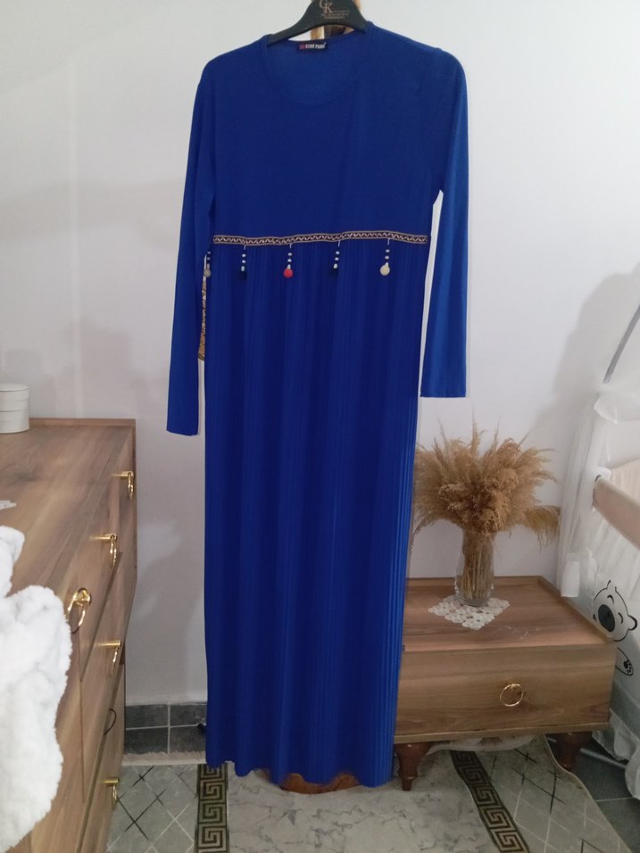 Diger markasının mavi uzun kollu, bol kesim kadın elbisesi. Etnik nakışlar ve belde püsküller bulunur. Yumuşak sentetik kumaştan, günlük kullanıma uygundur.
