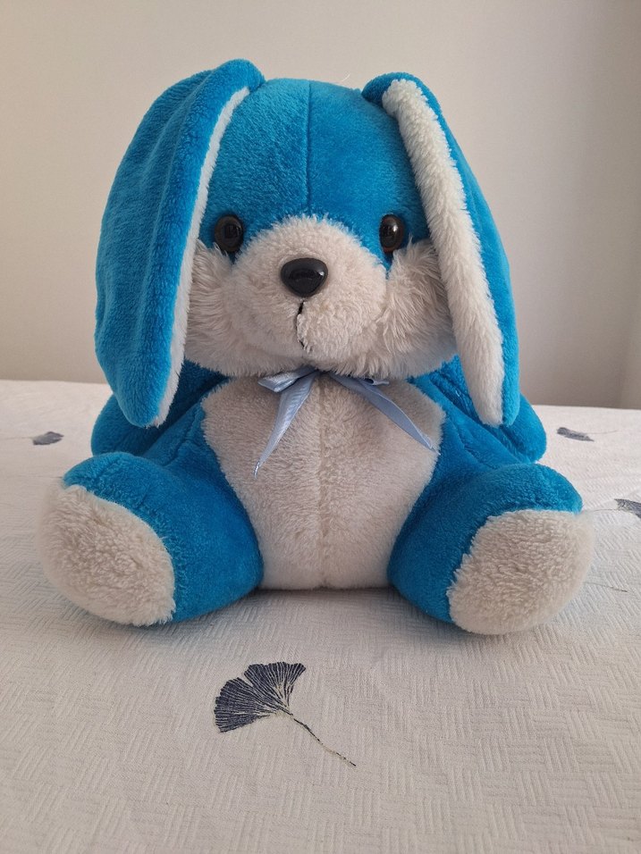 Diger peluş oyuncak, yumuşak kumaş ve sarkık kulaklarla mavi ve krem renklerde tasarlanmıştır.