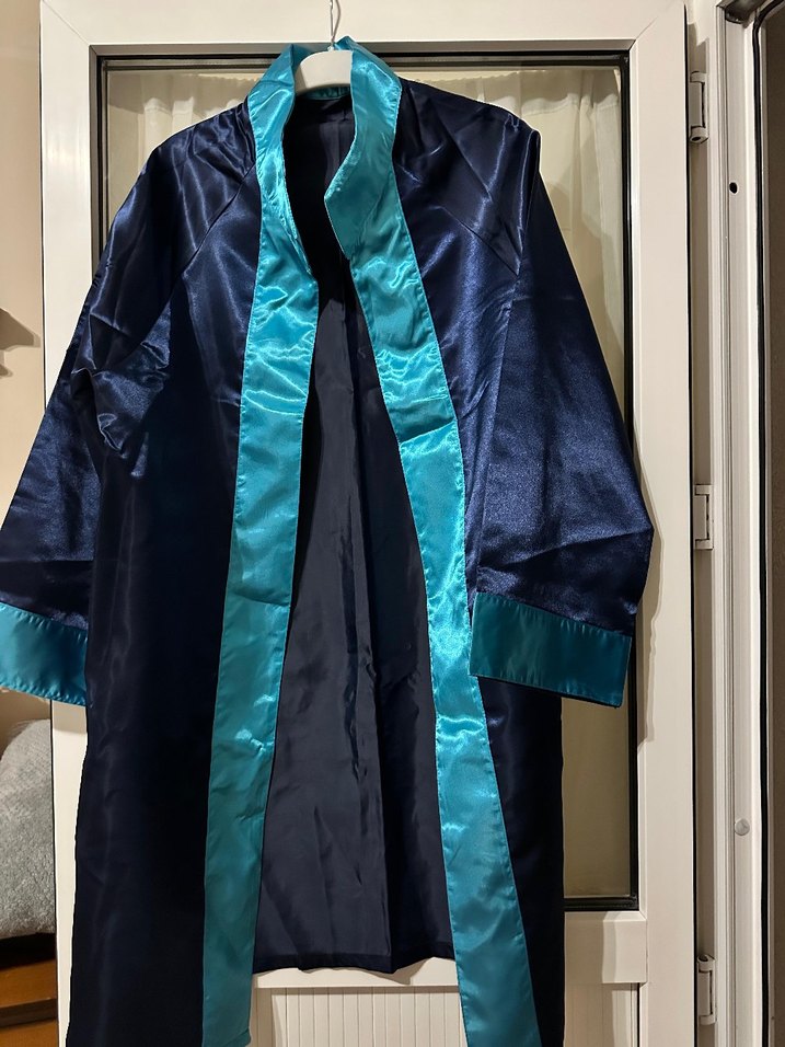 Diger markanın parlak mavi, kapüşonlu ve nakışlı uzun kadın mezuniyet elbisesi. Püskül aksesuarı ve regular fit kesimi ile ofis için uygun, minimalist tarzda.
