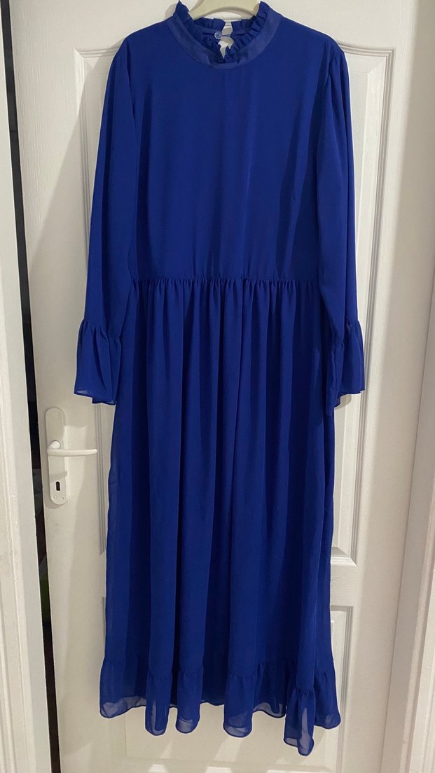 Bol kesim ve fırfırlı detaylara sahip uzun elbisesi. Bir defa giyildi iyi durumda.