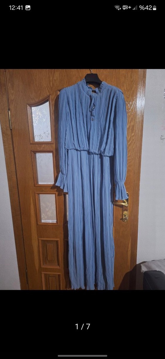 mavi uzun piliseli elbise .yüksek yaka ve uzun kolludur. Gevşek kesimi ve vintage bohem tarzıyla günlük kullanıma uygundur. bebek mavisi tül elbise beden skalasi geniştir sadece etek ucunda minik bi lekesi var baska bir defosu yoktur bir kez giyildi