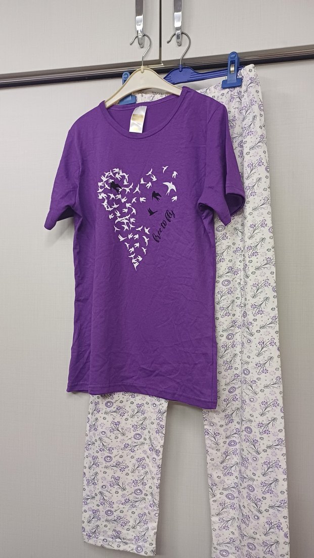 Diger markasına ait, kuş desenli baskılı mor kısa kollu üst ve renkli desenli beyaz uzun pijama altından oluşan rahat ve salaş pijama takımı.