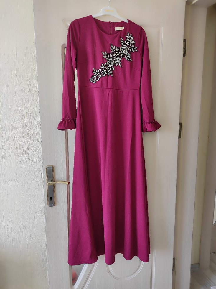 Diger markasına ait mor uzun kollu, yüksek yakalı ve nakış detaylı uzun elbise. Bol kesim ve dökümlü sentetik kumaş kullanılmıştır.