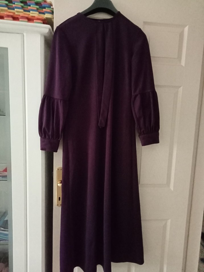 Diger markasının mor uzun elbisesi, salaş kesimi ve manşetli uzun kollarıyla rahat ve goth tarzı sunar, desensiz tasarıma sahiptir.