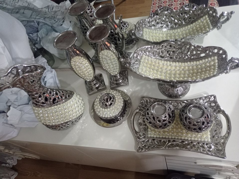 Diger marka, parlak beyaz renkte, inci desenli, geleneksel tarzda dekoratif sofra takımıdır. ️