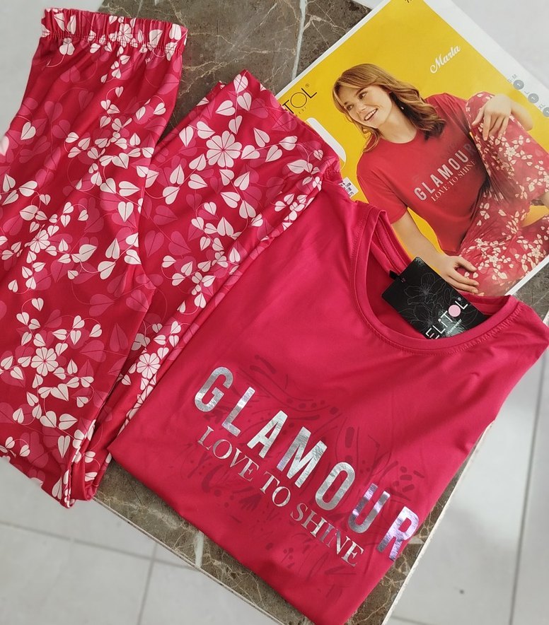 Diger markasına ait pembe renkli, kısa kollu, bol kesim kadın pijama takımı. Üzerinde 'LOVE, GLAMOUR, SHINE' yazılı baskı ve renkli desenler bulunur.