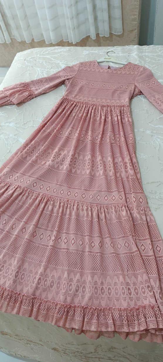 Pembe pastel renkte, nakışlı dantel detaylı, kayık yaka ve askılı kollu, bol kesim bohem tarzda uzun elbisedir.