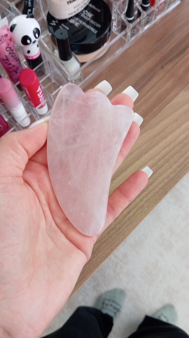 Pembe gül kuvars gua sha taşı, yüz masajı ve kan dolaşımını artırmak için pürüzsüz yüzeye sahip. Pastel pembe renk.