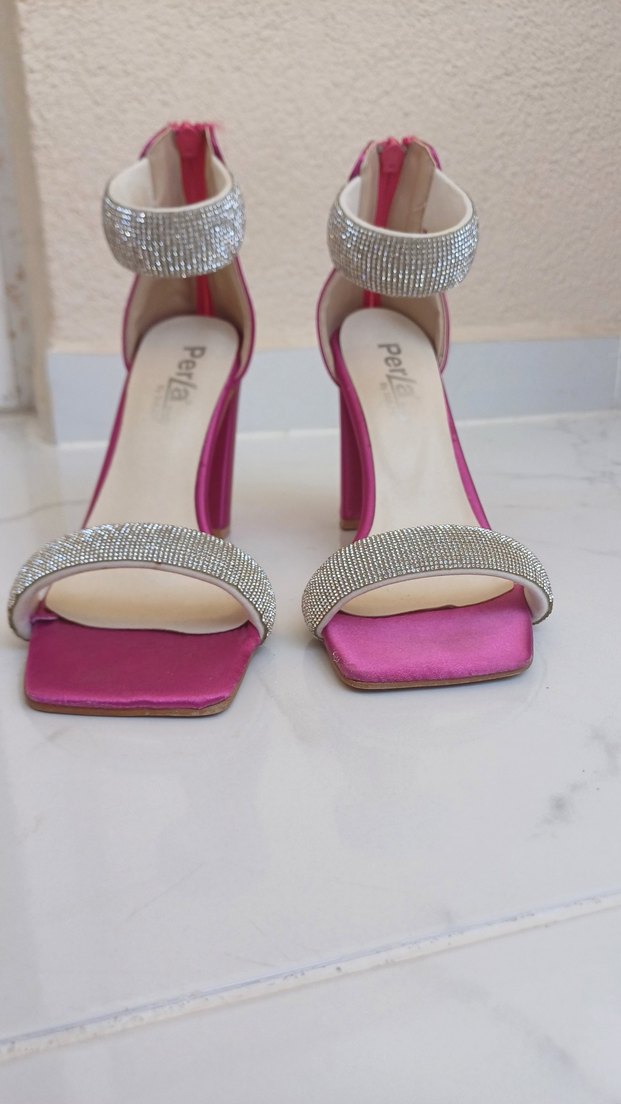 Diger markanın pembe parlak taşlı topuklu kadın ayakkabısı, sentetik kumaştan yapılmış ve çağdaş şıklık sunar. Düğünler için uygun, zarif bir modeldir.