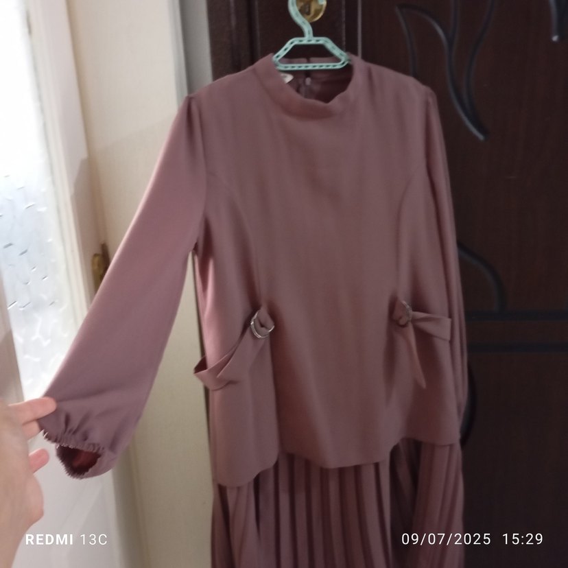 Yüksek yakalı, uzun kollu ve bol kesim Diger bluz, yumuşak sentetik kumaştan yapılmıştır. Pileli tasarımı ve pastel pembe tonuyla ofis için uygundur.
