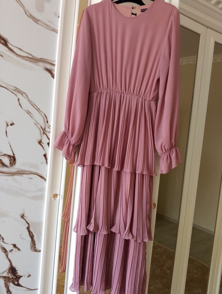 Diger Pileli Pembe Uzun Kadın Elbise