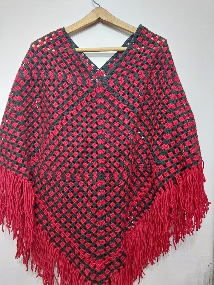 Renkli bohem stilde, V yaka ve bol kesime sahip örgü ponço. Askılı kollu ve püsküllü, günlük kullanıma uygun retro tarzda.