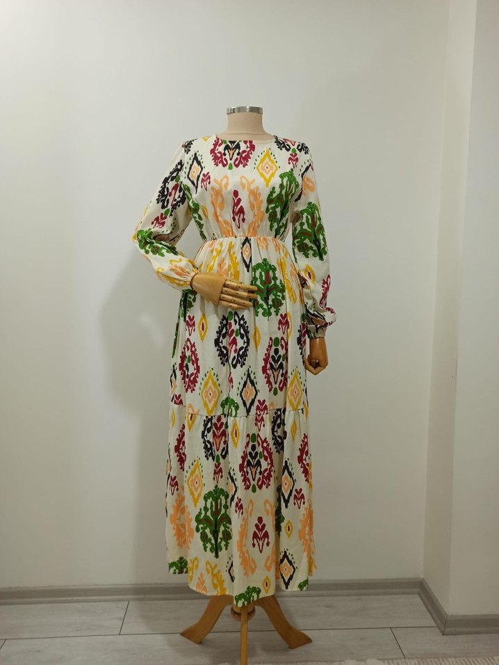 Diger markanın çok renkli tie-dye desenli, bol kesim ve drapeli uzun elbisesi. Bisiklet yaka ve uzun kolludur, bohem tarz için uygundur. S M uyumlu