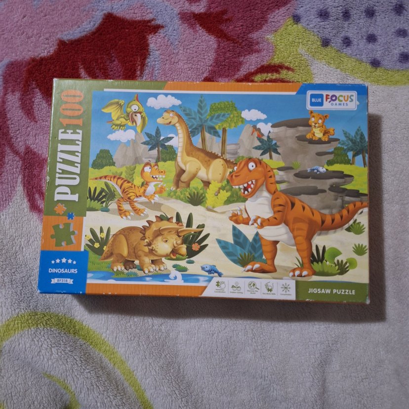Diger markasına ait, 103 parçalı renkli dinozor temalı çocuk puzzle'ı. Canlı renklerle çeşitli dinozorlar yer alıyor. Bir parçası kayboldu.