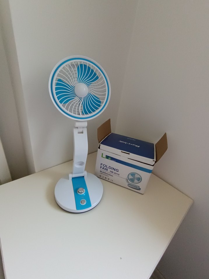 Diger renkli mavi masaüstü vantilatör, ayarlanabilir yükseklik ve iki hız kontrolü ile kişisel hava akımı sağlar. Kompakt ve kullanışlıdır. ️ sıfır üründür şarjlı şarj kablosu vardır sıfırdır