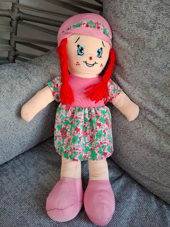 Diger markalı, kırmızı ip saçlı, çiçek desenli elbise ve pembe şapka ile ayakkabılı renkli bez bebek.