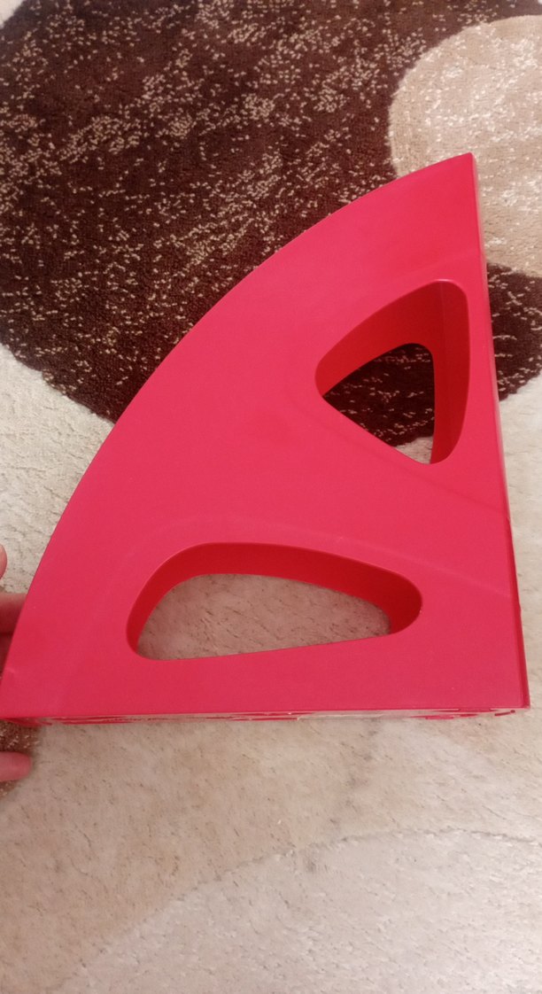 Diger markasına ait, keskin üçgen tasarımlı ve taşıma için kesik kulplara sahip renkli pembe çocuk rafı. Dosyasi