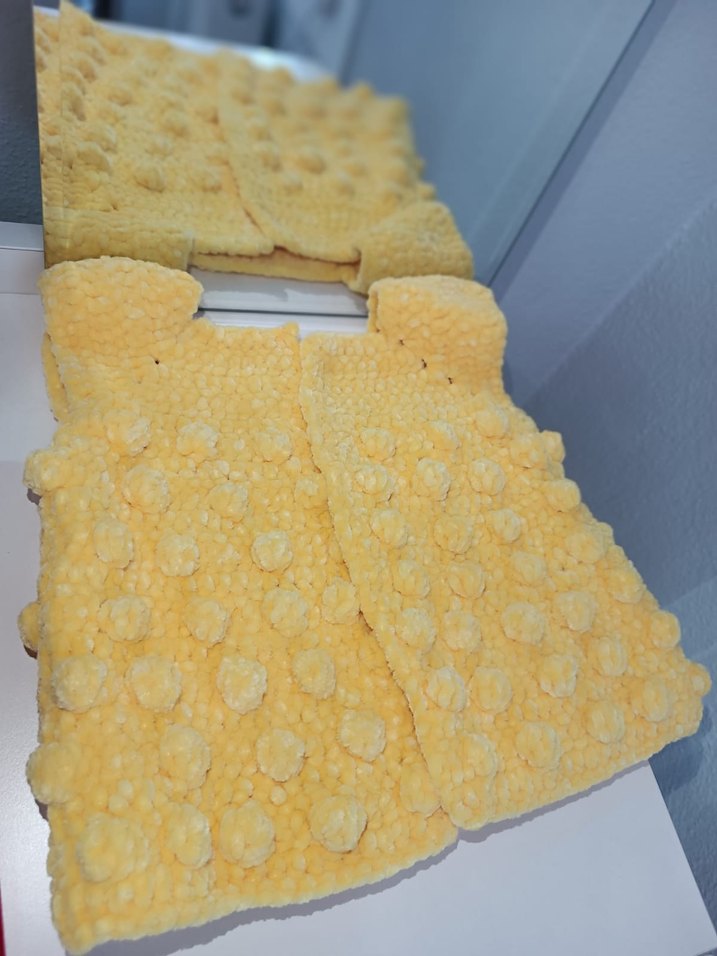Diger markasına ait, yumuşak dokulu, kabarcıklı yüzeye sahip sarı bebek önlüğü. Yemek sırasında bebeği temiz tutar.