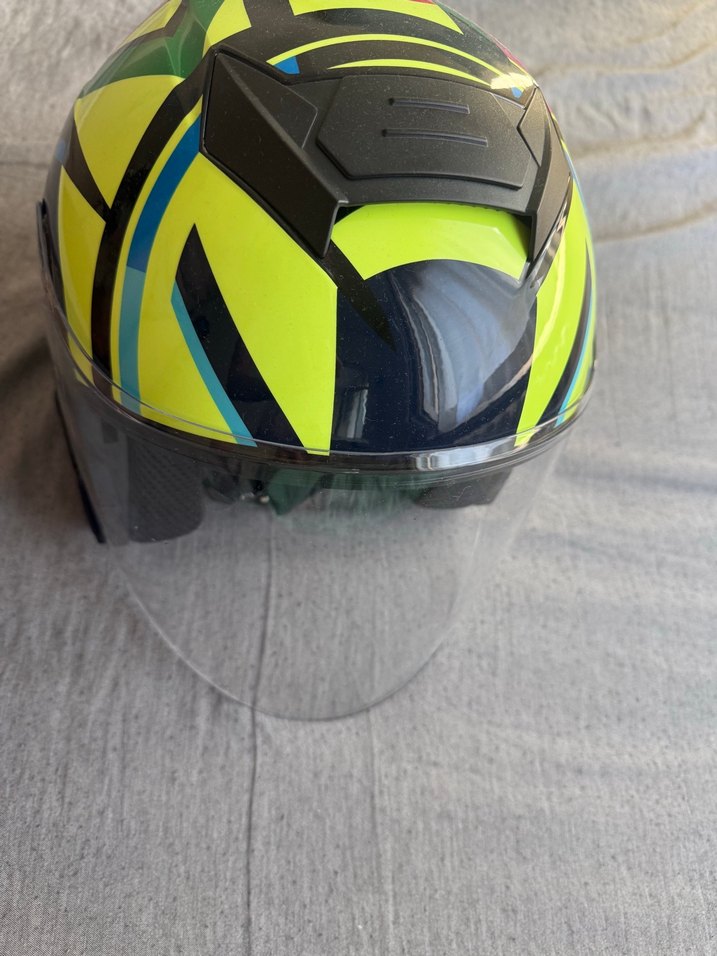 Diger markalı bu motosiklet kaskı, sarı renk ve siyah kauçuk detaylarla renkli baskıya sahip. Cırt cırtlı kayışla sabitlenir, sokak stili ve rock punk havası taşır. ️