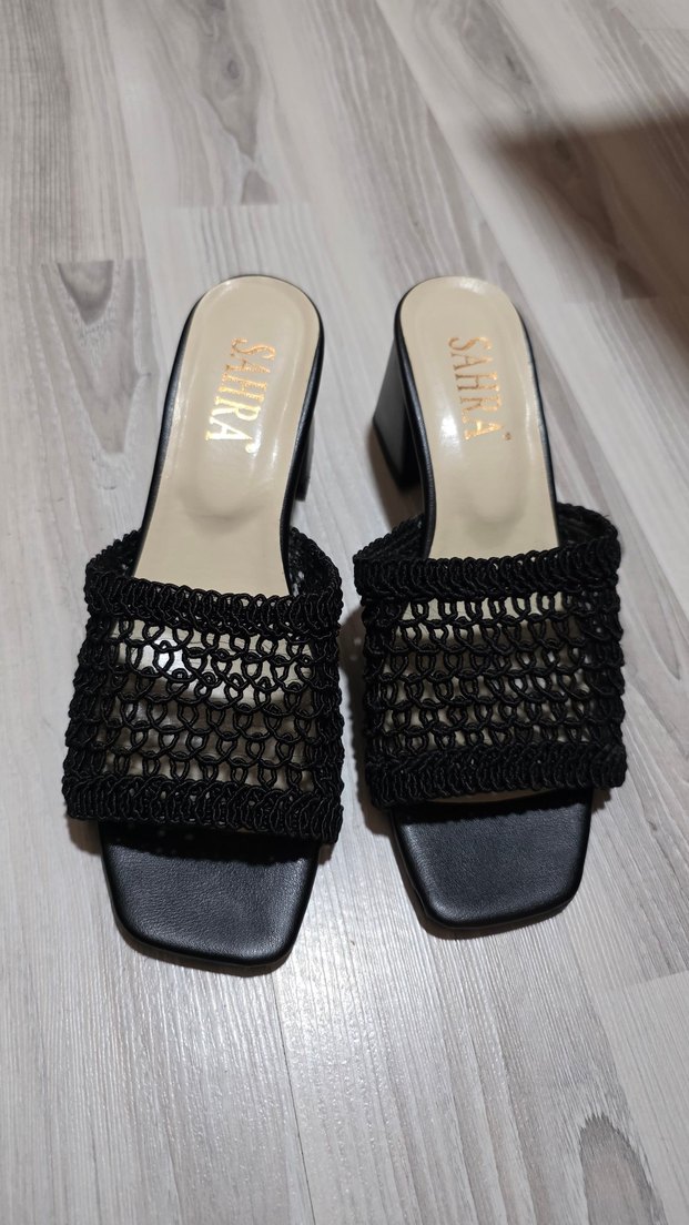 Diger markalı siyah blok topuklu terlik, dantel işlemeli tasarımıyla romantik akşamlar için uygun. Taban kauçuk malzemeden yapılmıştır.