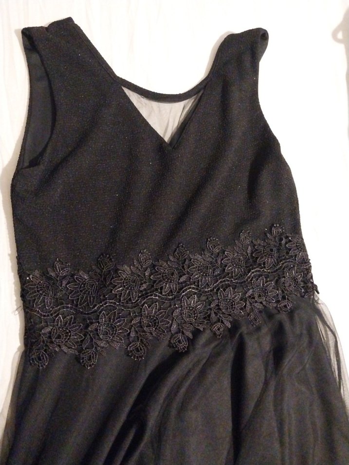 Diger markasına ait siyah, dantelli, V yakalı, kolsuz, abiye elbise. Midi boyda, gotik tarzda, parti için uygun.