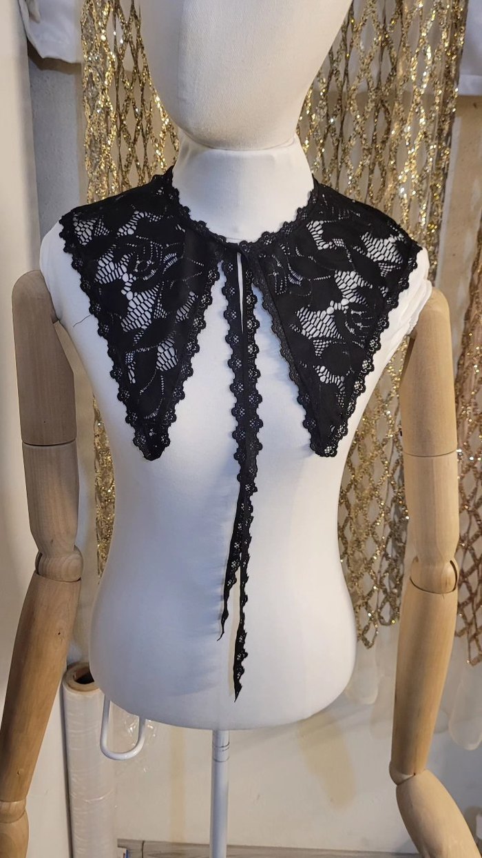 Diger markasına ait siyah dantelli, nakışlı, yakalı ve kolsuz triko bolero, gotik tarzda, vücuda oturan kesime sahiptir.
