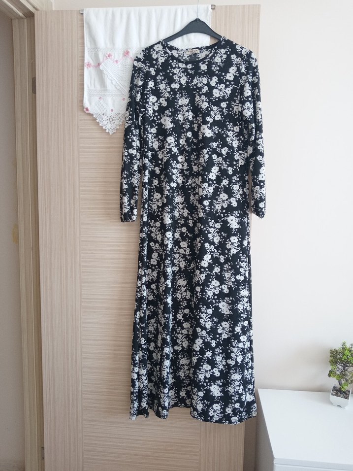 Diger markanın siyah ve gri bağlama desenli uzun elbisesi, sentetik kumaştan, bol kesim ve uzun kollu, yüksek yakalı, salaş ve dökümlü tarzda, günlük sokak giyimine uygun.
