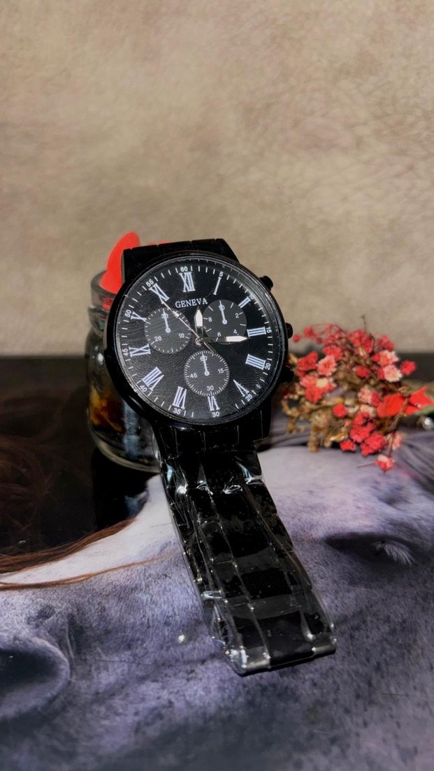 Diger erkek kol saatinde Roma rakamlı siyah kadran ve parlak koyu kayış bulunur, klasik ve gotik tarzı birleştirir. ⌚